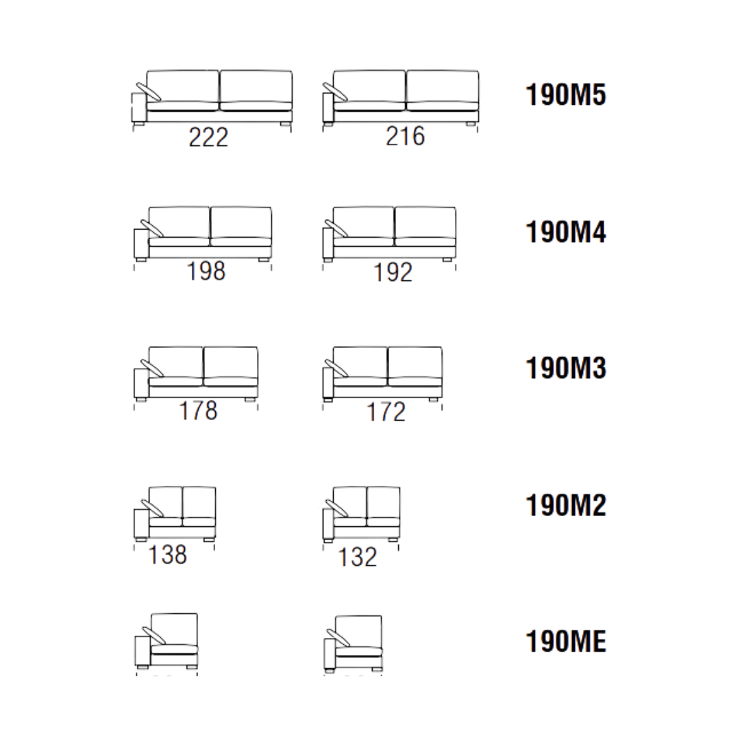 Înălțimea șezutului este de 45 cm, iar lungimea modulelor variază între 110 cm și 240 cm, în funcție de configurație.
