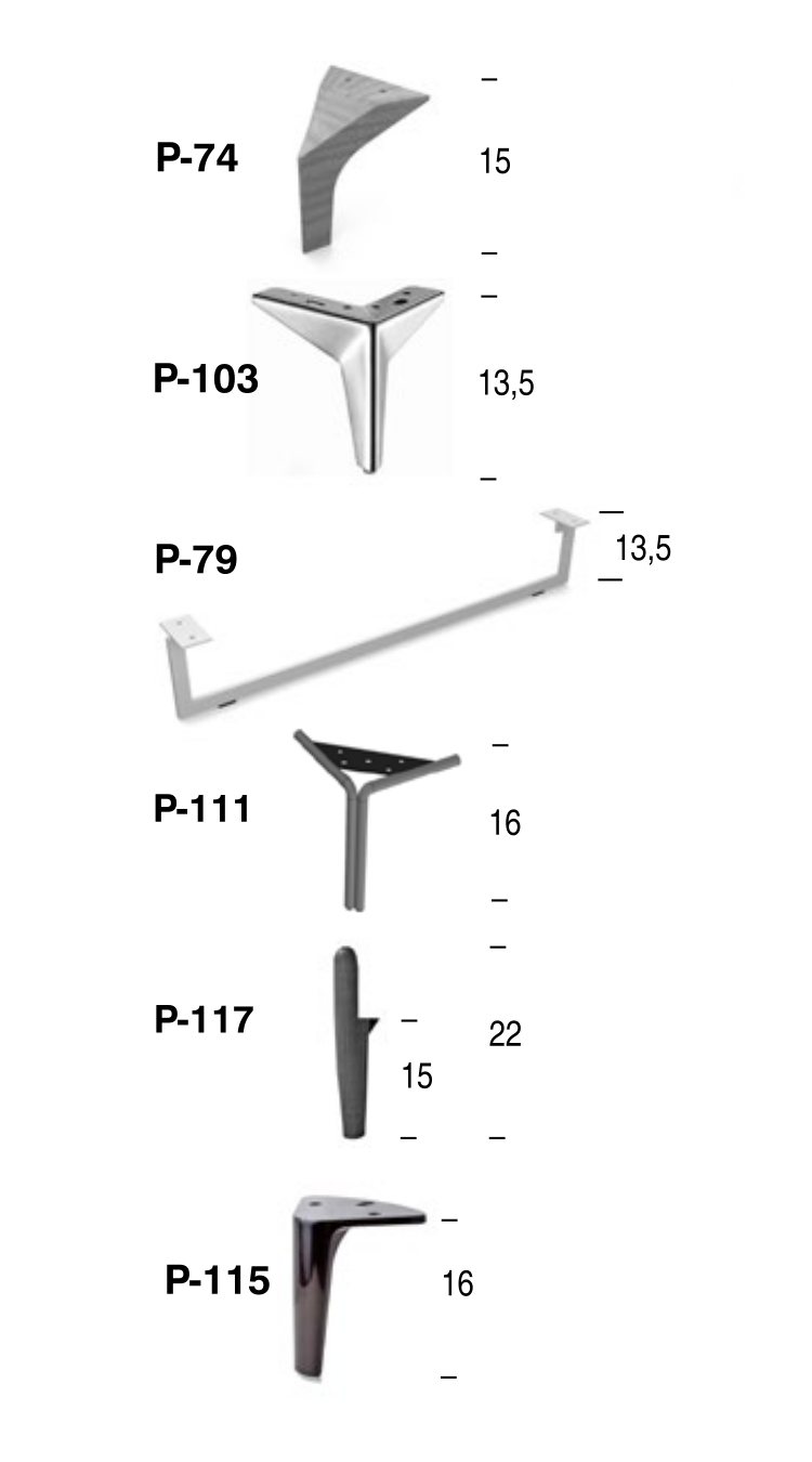 - Pentru varianta de picioare din metal sunt disponibile următoarele finisaje: oțel inoxidabil (model P79), crom (model P103, P115), nichel negru (model P111, P115), negru (model P111, P115).
