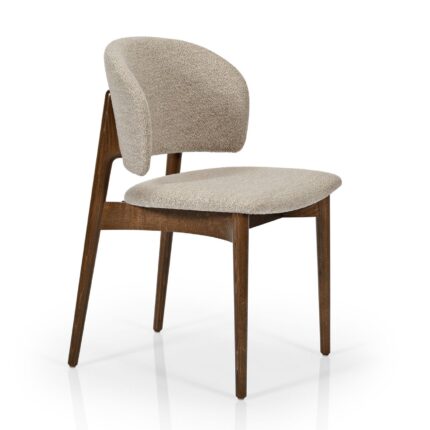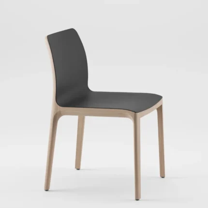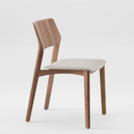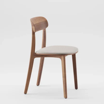 Structura din lemn evidențiază calitatea materialului și stabilitatea construcției, în timp ce formele ușor rotunjite adaugă un plus de rafinament și confort vizual. Spătarul ergonomic și șezutul tapițat asigură o poziție confortabilă, fiind ideal pentru utilizare zilnică în zona de dining sau în spații horeca.