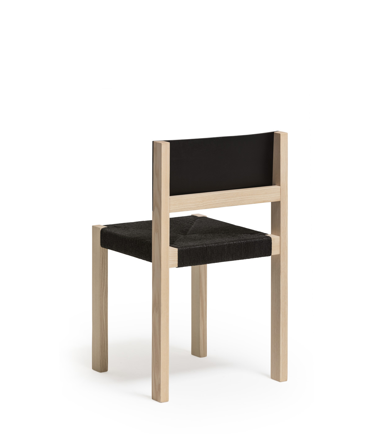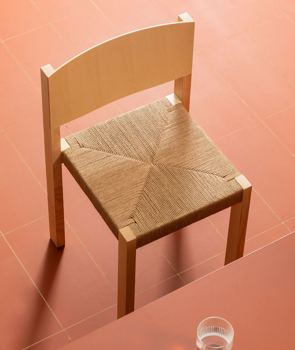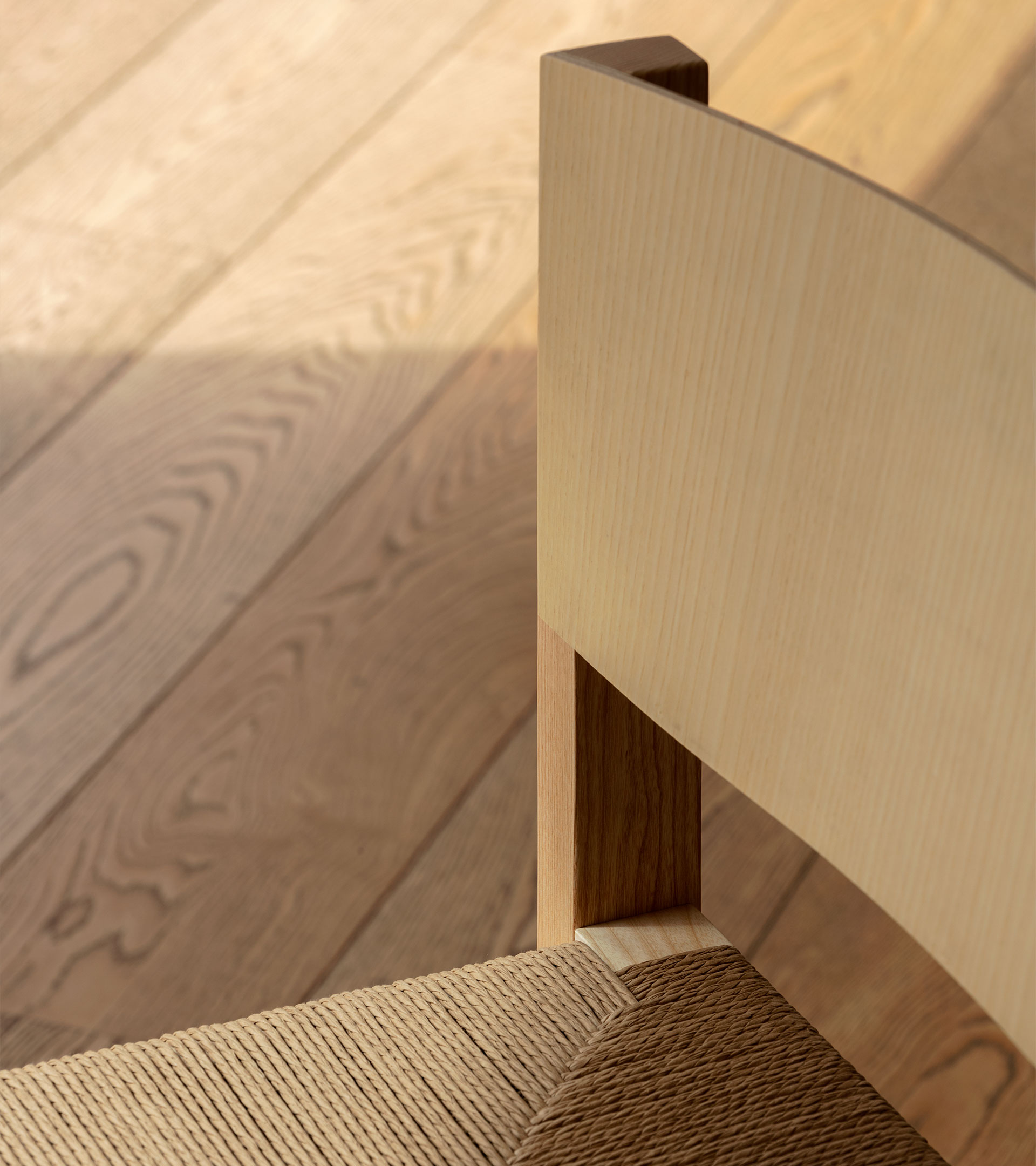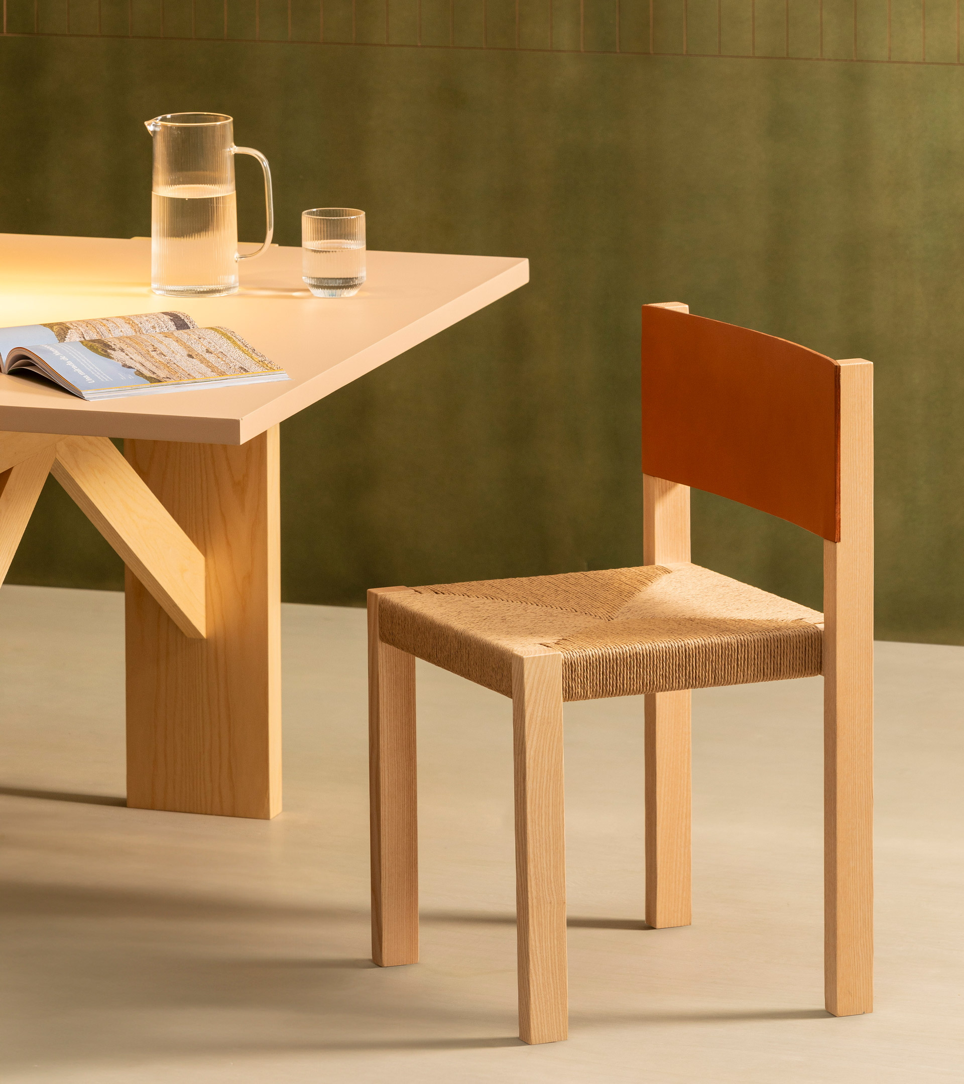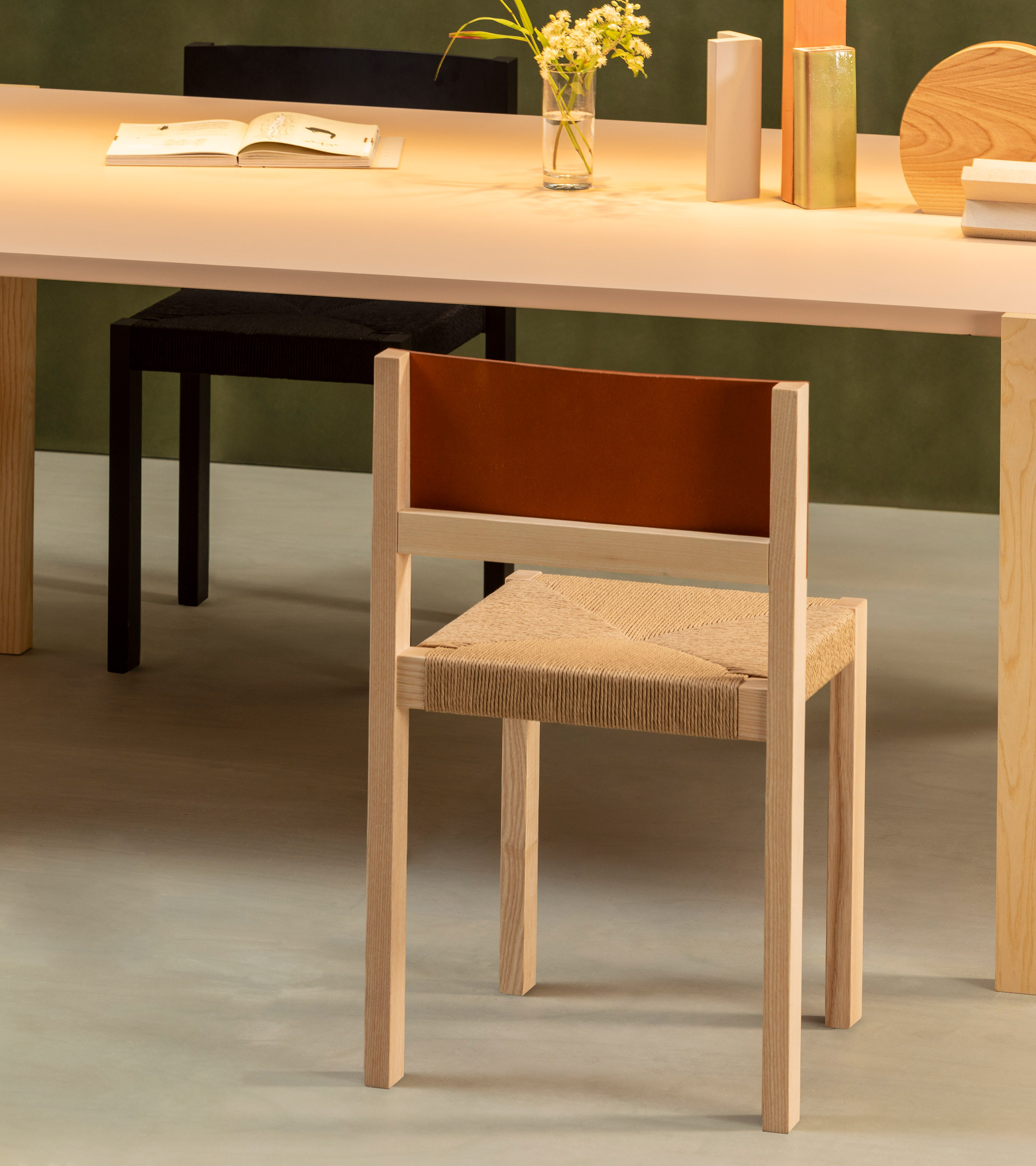 Geometria sa rafinată și intenționat simplă pune în valoare materiale precum lemnul de frasin, funia și pielea.