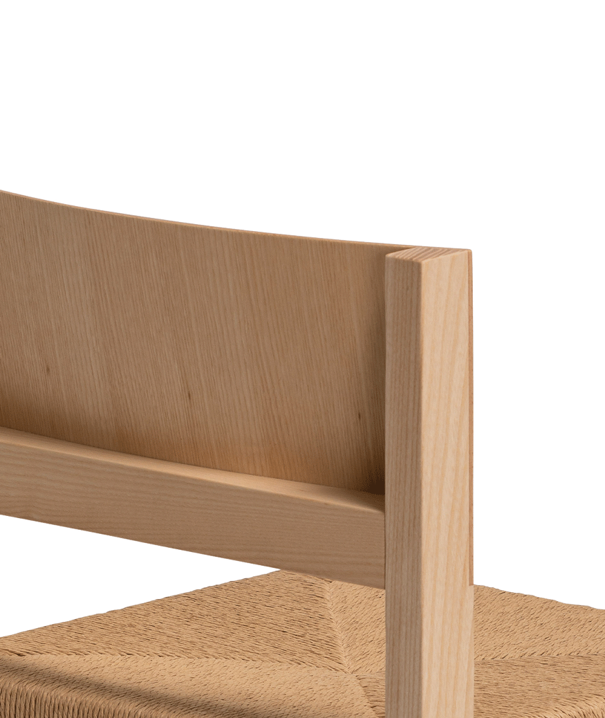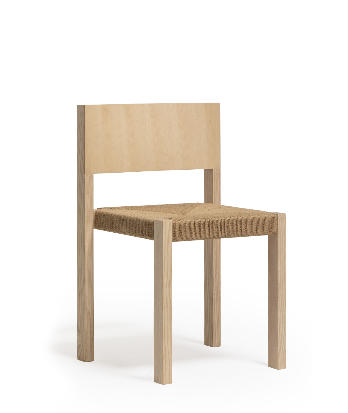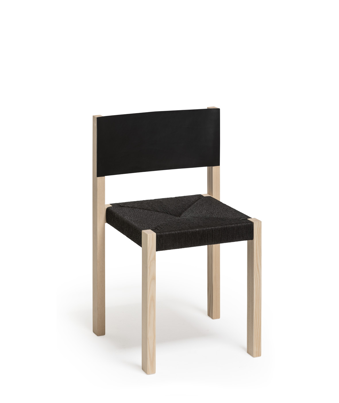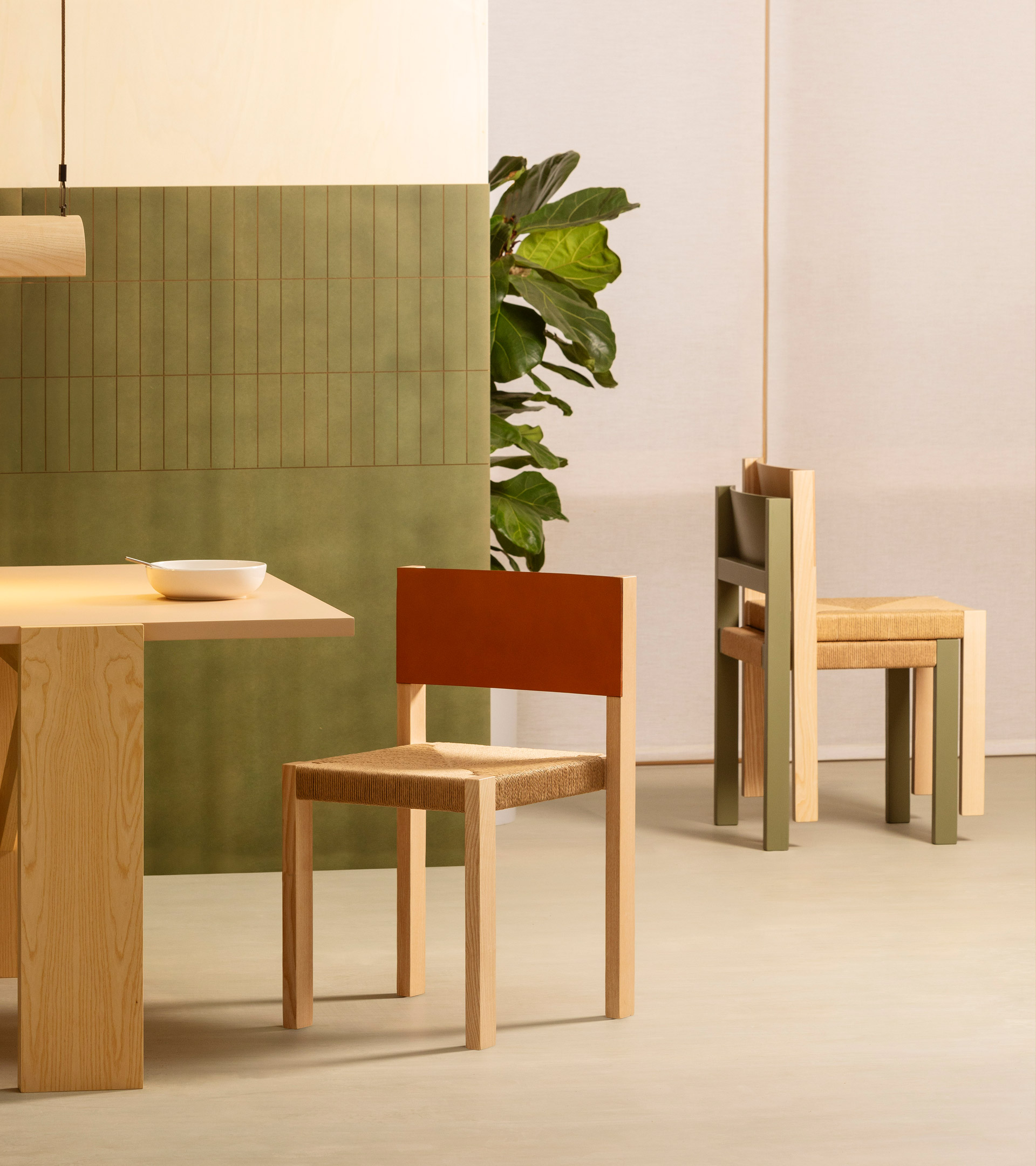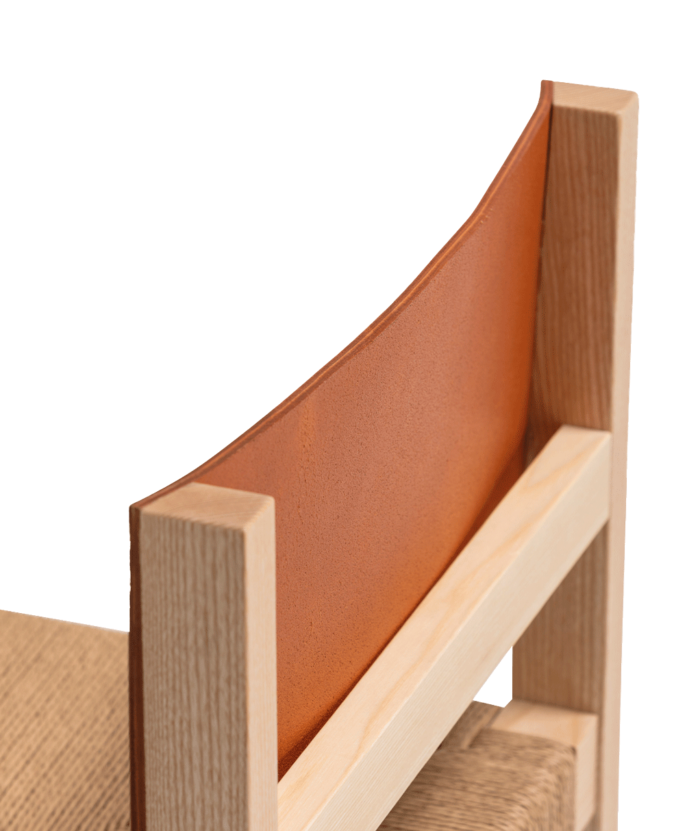 Geometria sa rafinată și intenționat simplă pune în valoare materiale precum lemnul de frasin, funia și pielea.