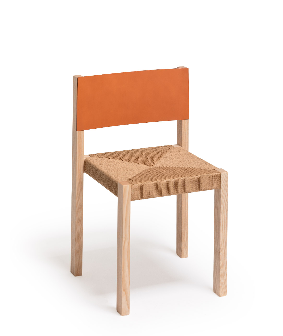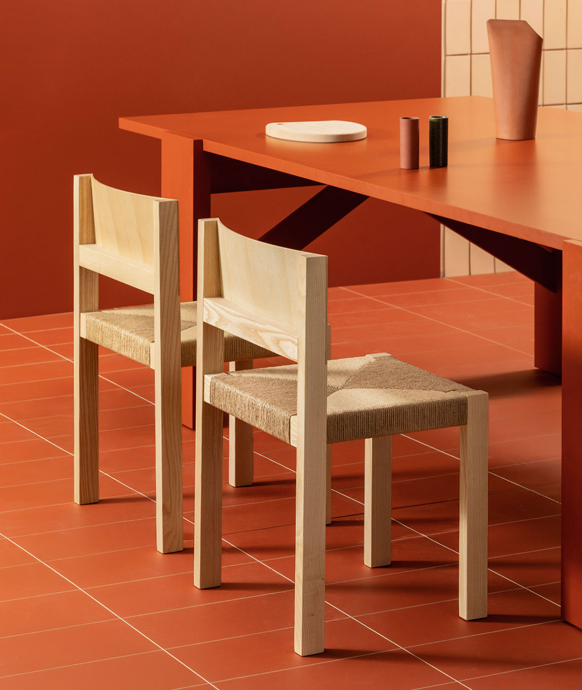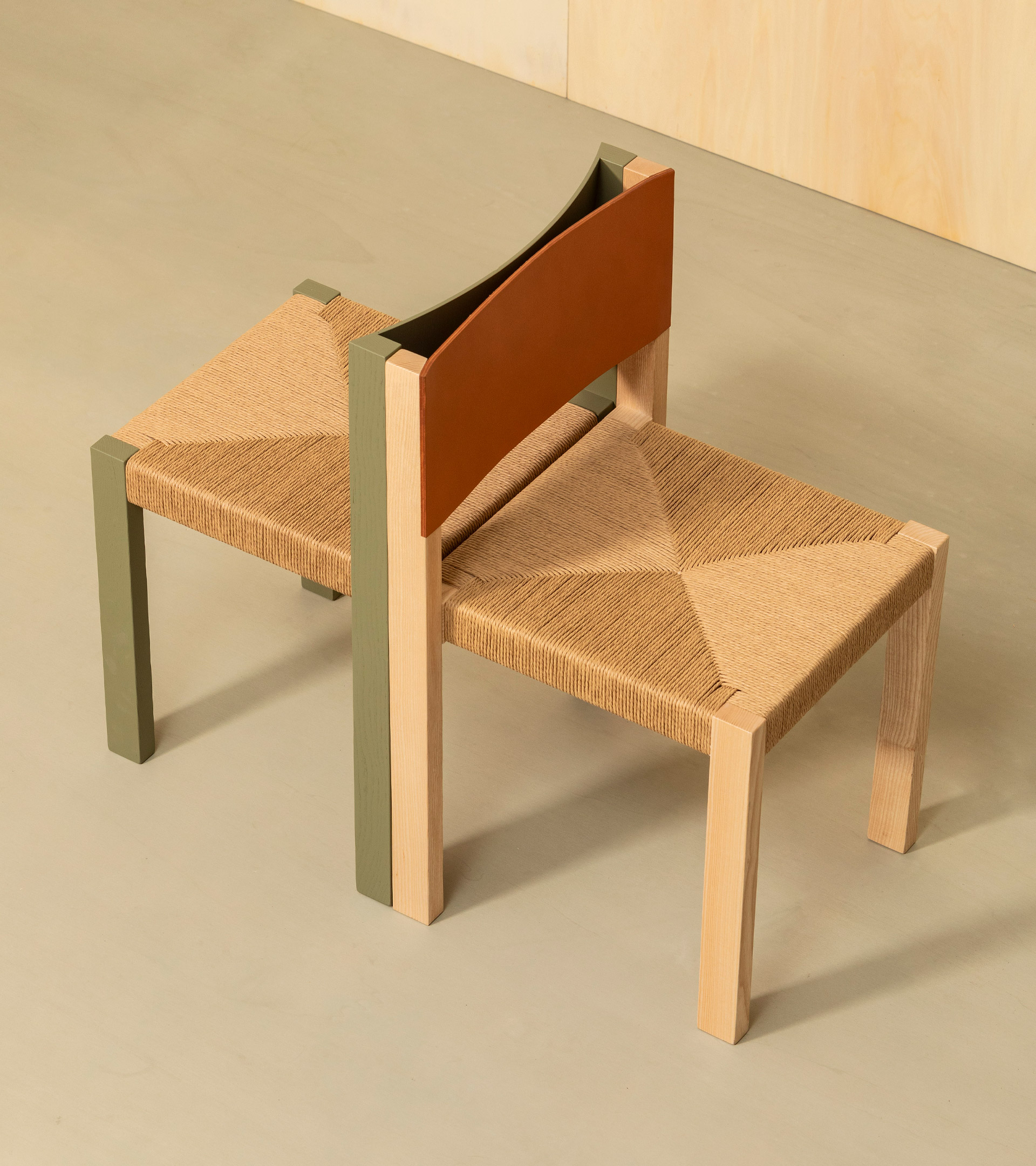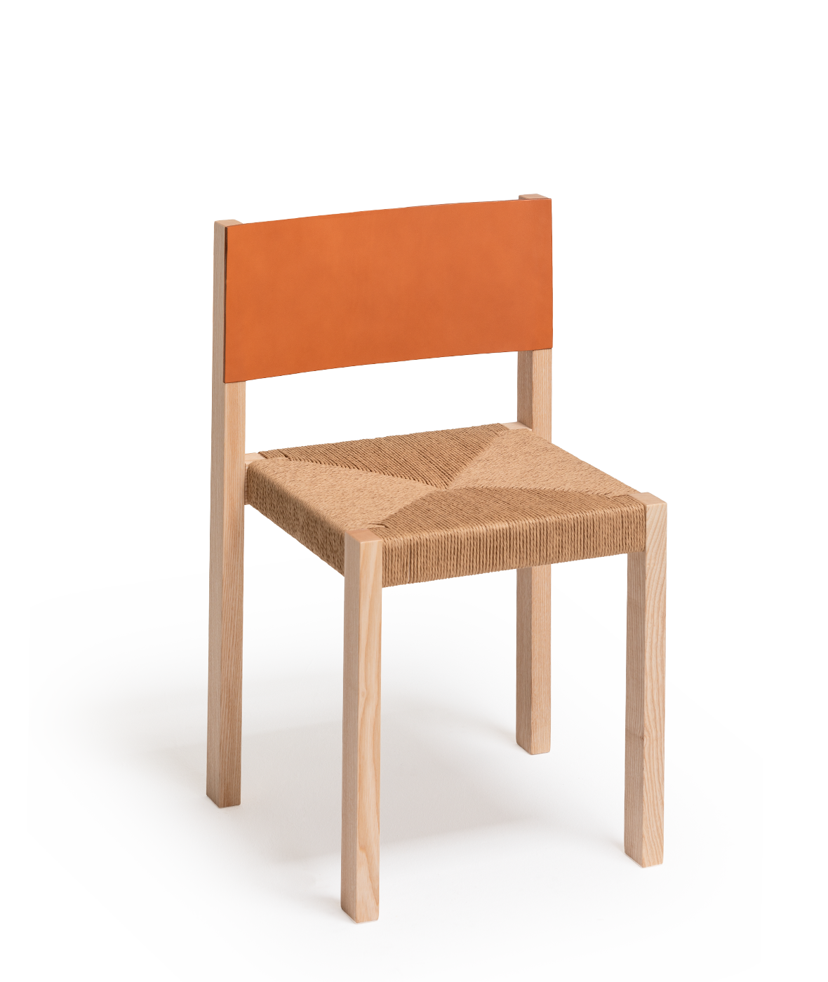 Geometria sa rafinată și intenționat simplă pune în valoare materiale precum lemnul de frasin, funia și pielea.