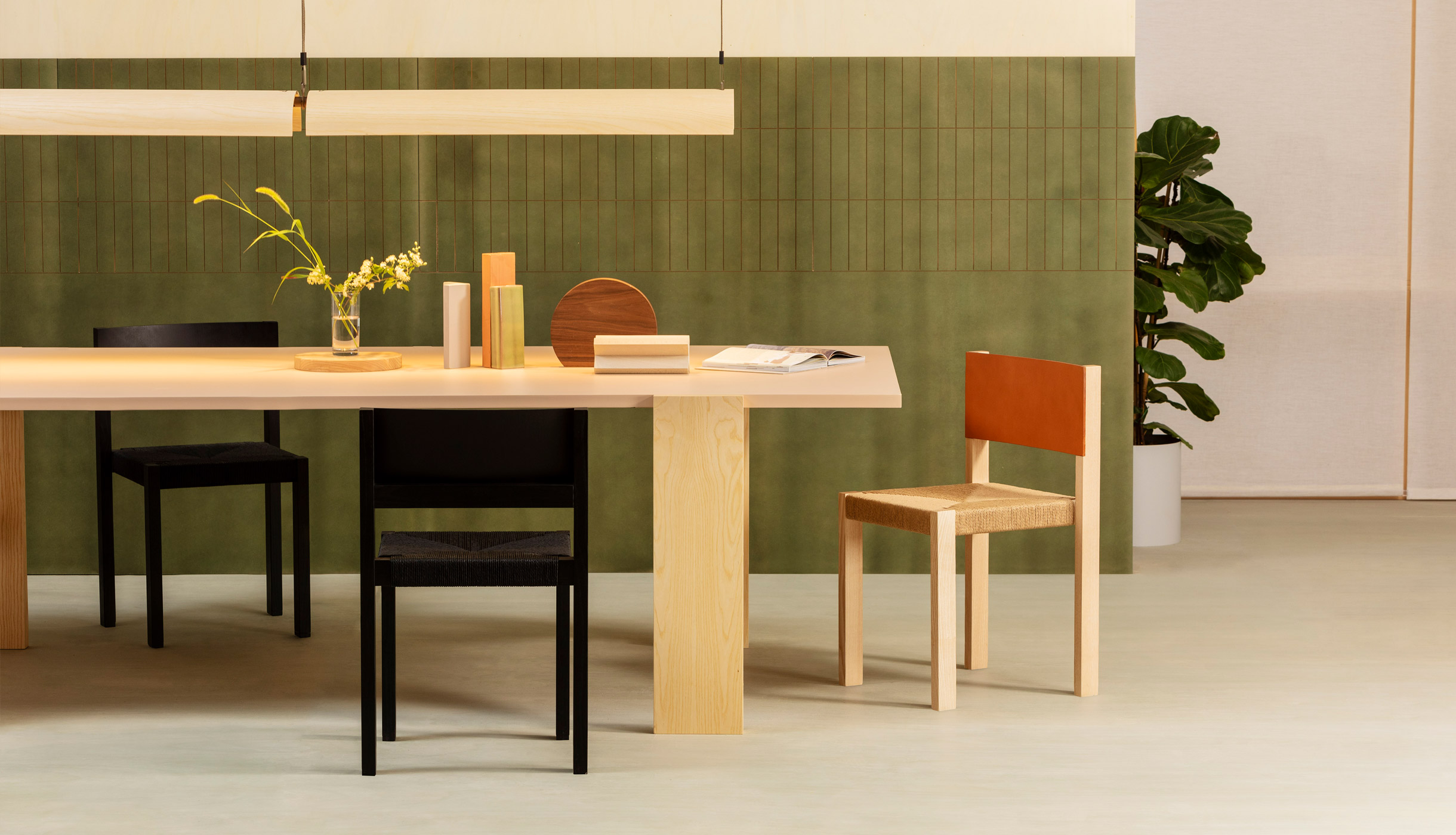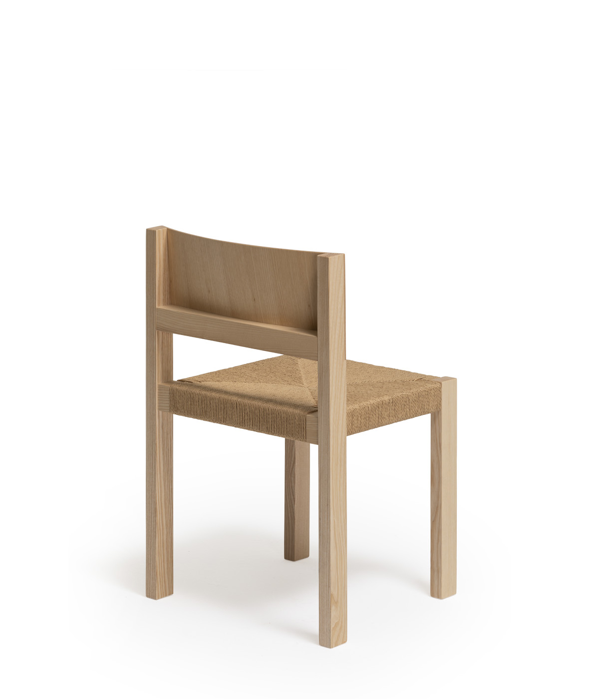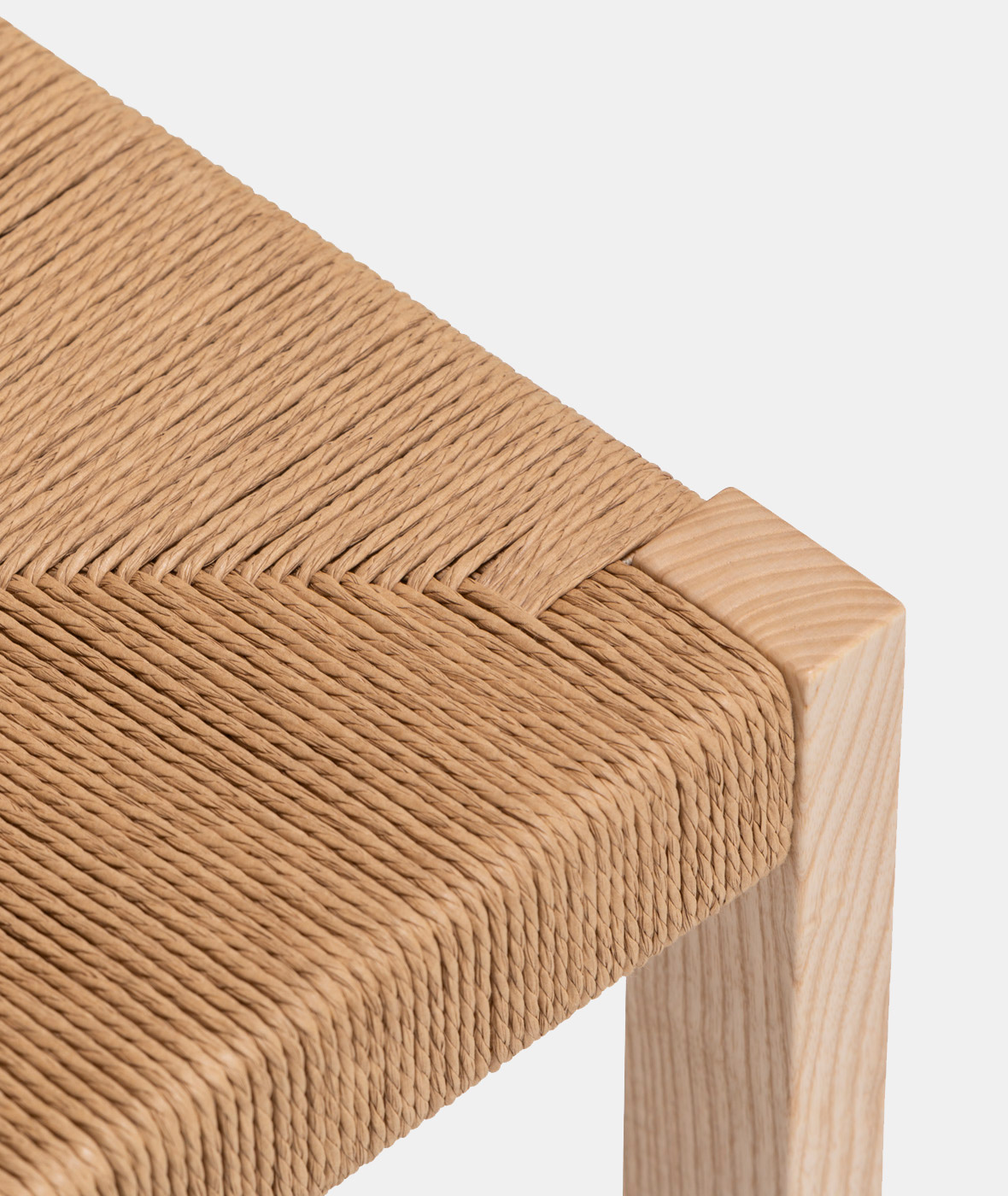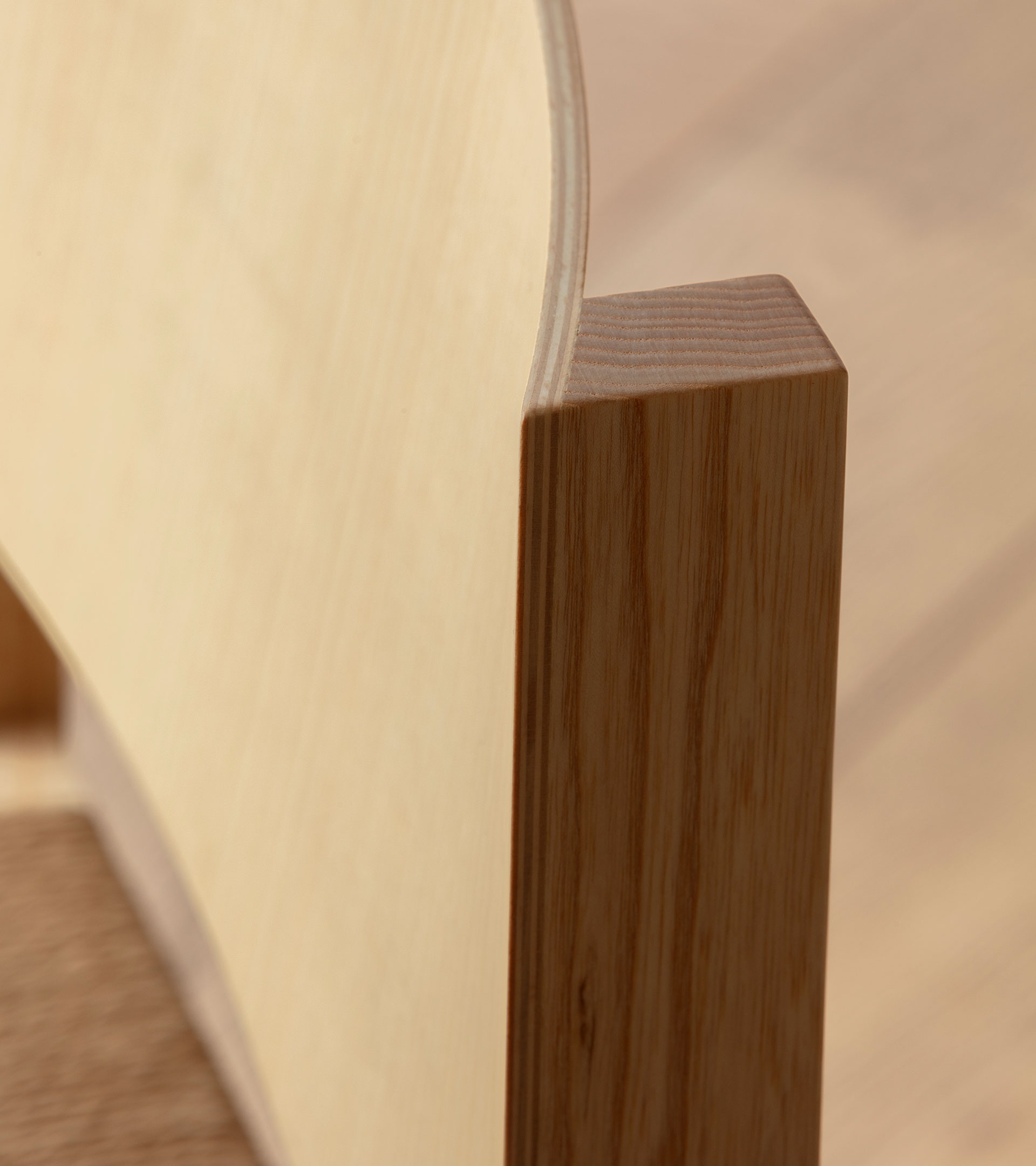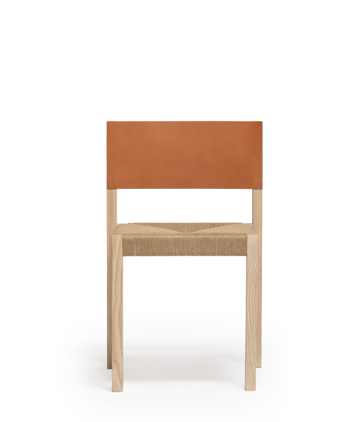 Geometria sa rafinată și intenționat simplă pune în valoare materiale precum lemnul de frasin, funia și pielea.