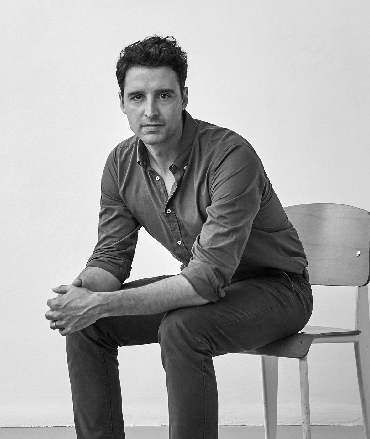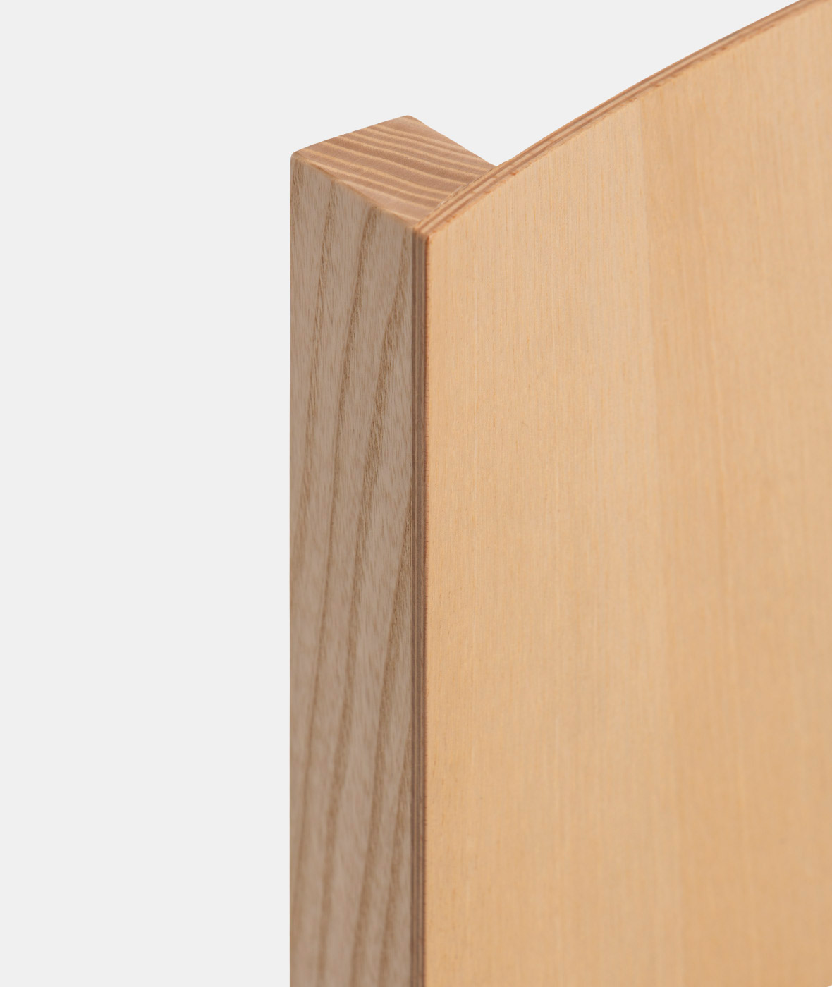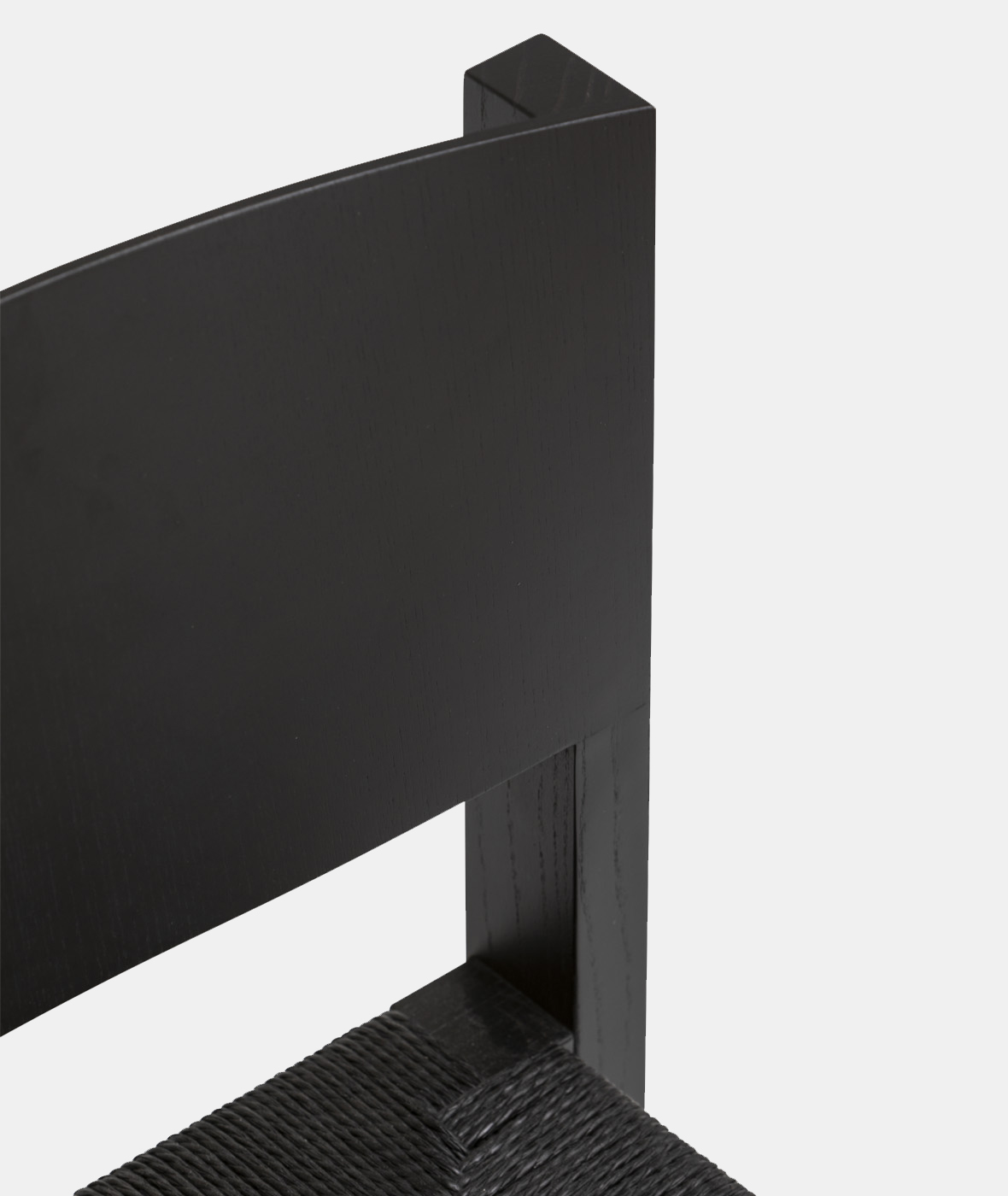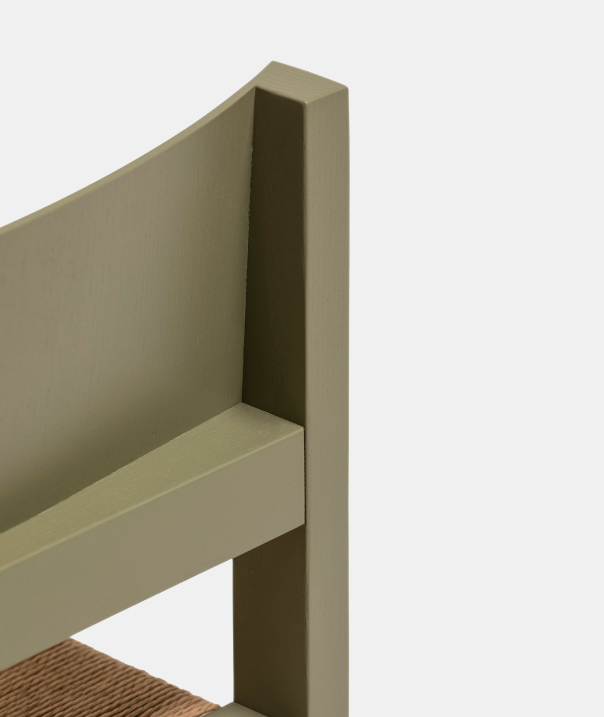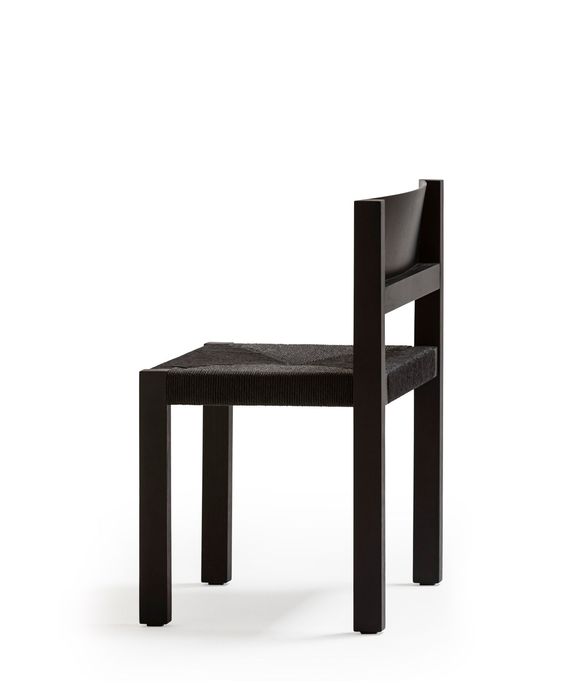 Geometria sa rafinată și intenționat simplă pune în valoare materiale precum lemnul de frasin, funia și pielea.