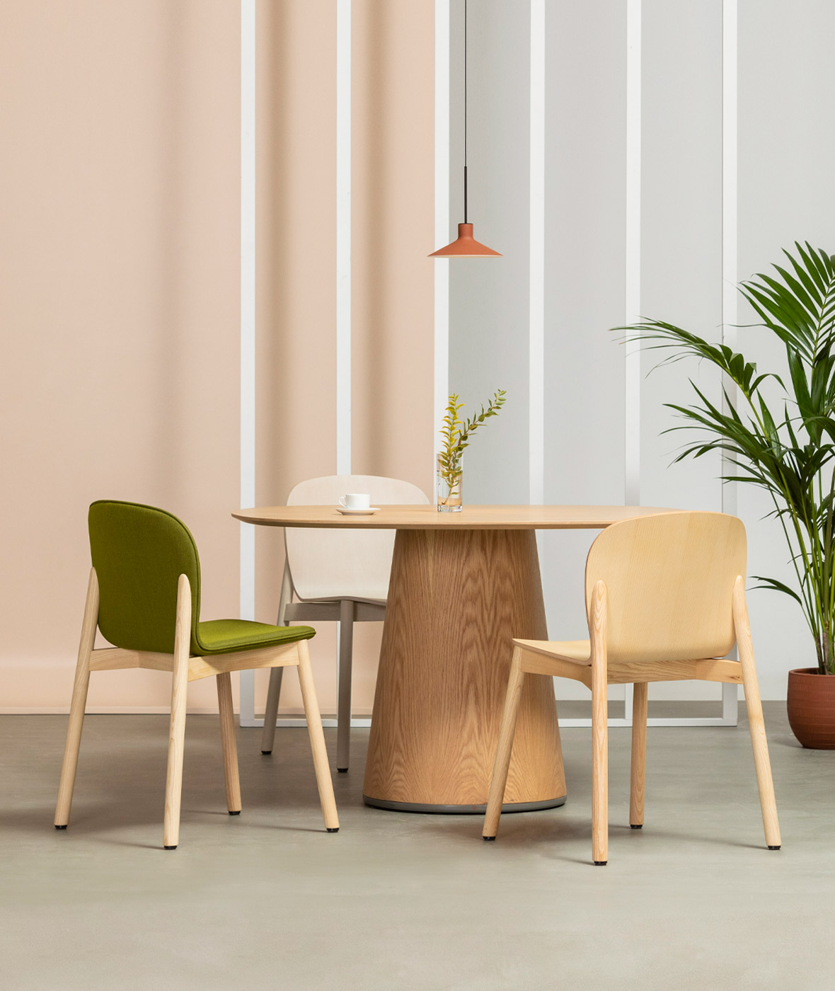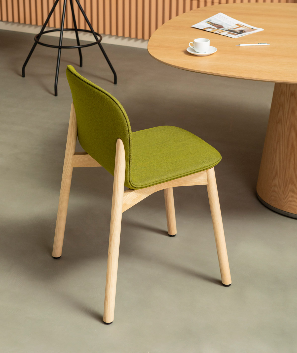 Scaunul Ona, creat dintr-o singură foaie de placaj curbat, impresionează prin formele sale rotunjite și elegante. Versatil și cald, se adaptează cu ușurință diverselor spații, oferind multiple combinații de finisaje și materiale pentru un stil personalizat.
