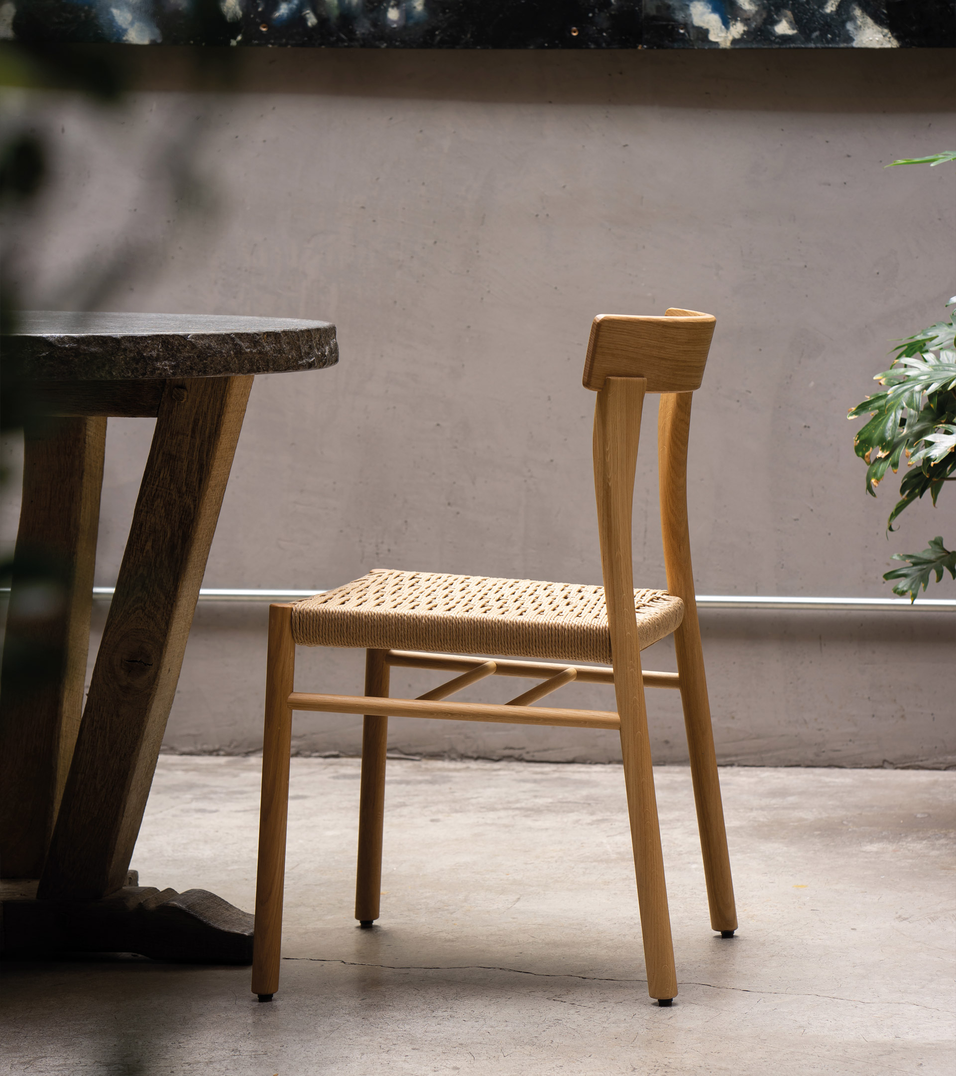 Fabricat din lemn masiv, se remarcă prin picioarele din spate ușor curbate, care se lățesc pentru a susține un spătar confortabil și primitor.
